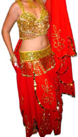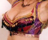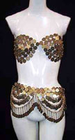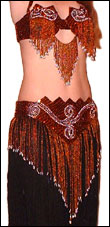 But pre-made metal sets are available from Cost Less costumes. They make high end coin, mirror, foil and crystal sets ranging from 500 to over 1,000 dollars. Sara Skinner sells attractive middle of the road coin and mirror sets for around 300 dollars. India manufactures metal belts, necklaces, and anklets. Importers often promote it as Belly dance wear. It isn't belly dance wear. India has nothing to do with belly dance and they do not produce belly dance costuming. However, it's dirt cheap and a lot of folks feel it, and other Indian products, carry over well. For pre-made bra and belt forms Sugar Petals gets the most action. L Rose Designs and Glitzy Gypsy custom make lovely American Belly dance Costumes.