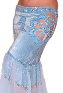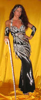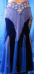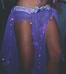 Gowns and bra with sleek skirt is where it's at. If there is fringe on the costume; chunky beads are used, often grouping several strands together and placing them sparingly on the pelvic area. Gowns and bra/skirts are made of like fabric (variants of lycra rule). Gowns often have mesh covered cut outs on the mid-section.